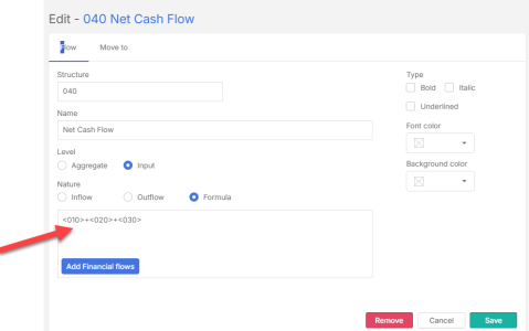 To add a new financial flow, start by creating the top-level line of the structure.