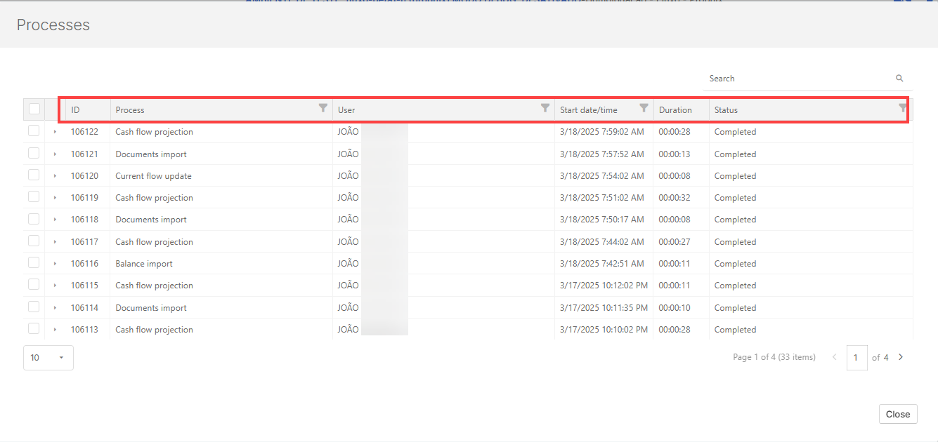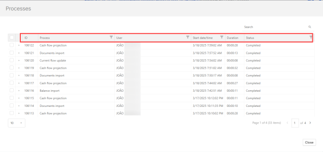 The Processes page is your go-to hub for tracking and managing system activities in Cash Management. Whether you are running integrations, importing data, or projecting forecast calendars, this tool helps you stay informed and in control. For each process, key details such as request duration, execution status, responsible user, start date and time, and overall status are available.