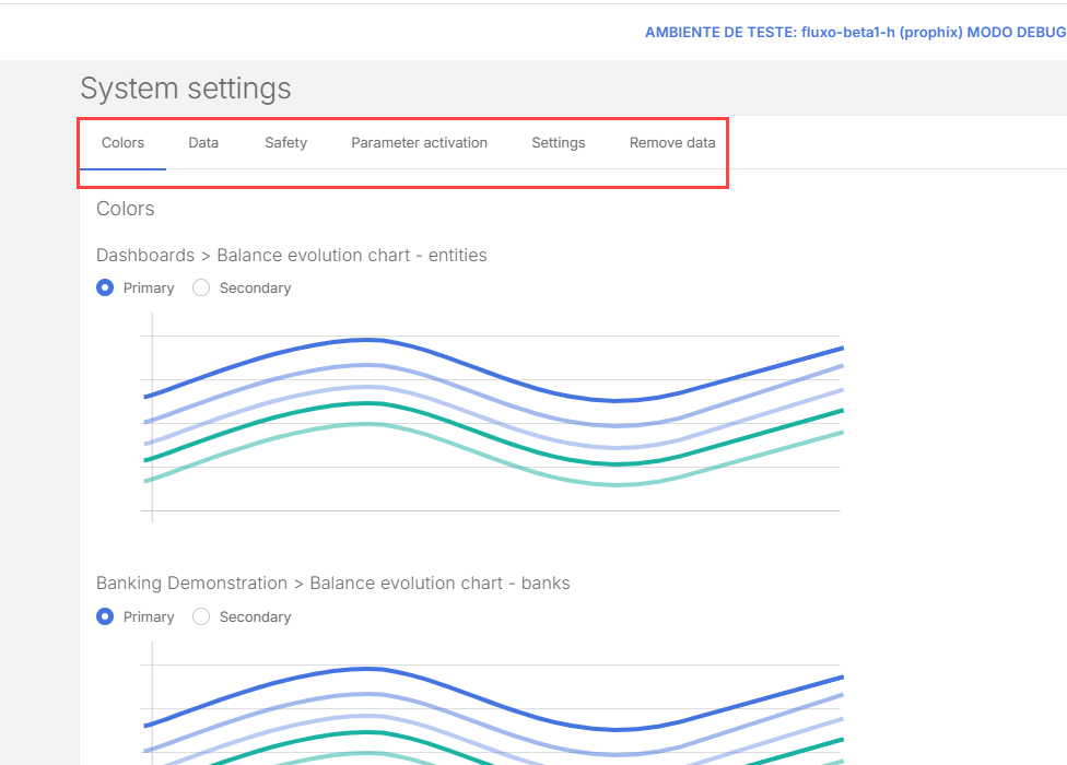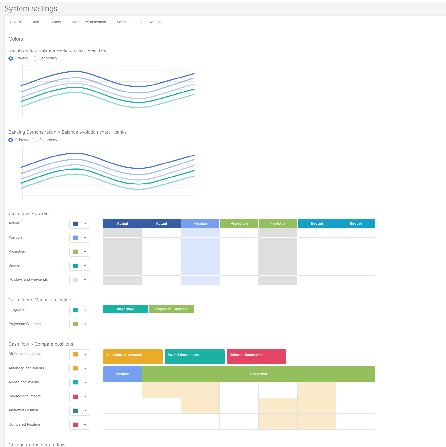 In the Colors tab, choose the Primary and Secondary colors for the different sections: Dashboards, Banking Demonstrations, Cash flow > Current, Cash flow >Manual projections, etc.