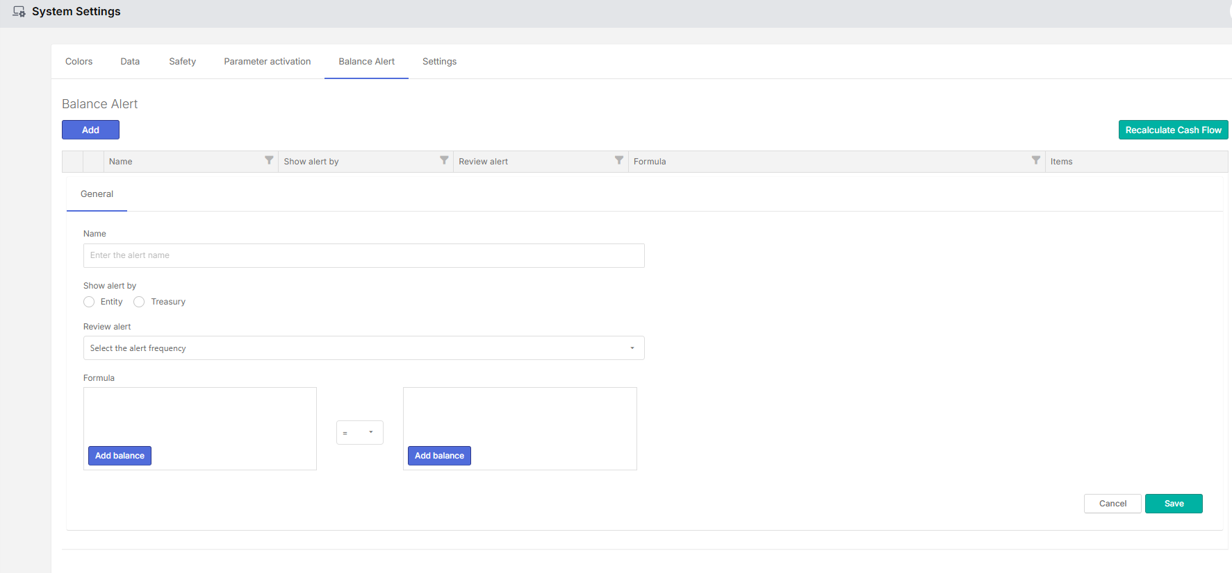 Configure alerts for balance monitoring in Cash Management. These alerts help identify when balances require attention during cash flow processing. Administrators define how and when balance alerts should be generated. Alerts can be configured at different levels to match the organization’s monitoring needs.