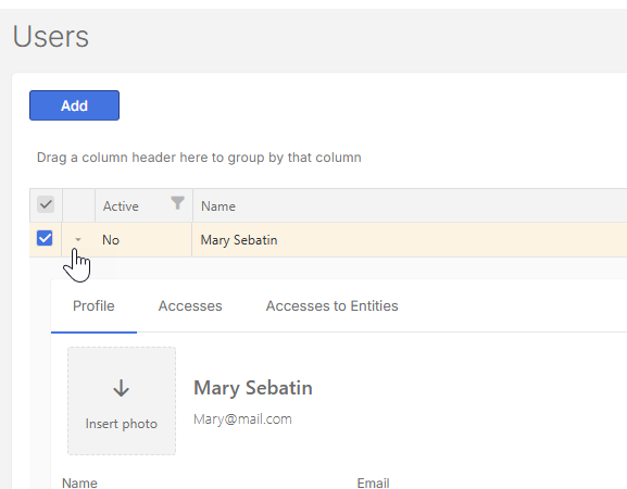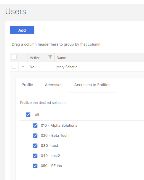 . Note: If the user is not an Administrator, two additional tabs appear to the right of the Profile tab: Accesses and Accesses to Entities. In this case, the user’s access within the application must be specified.