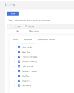 Accesses: Choose which areas (like Cash Flow or Contracts) the user can access.