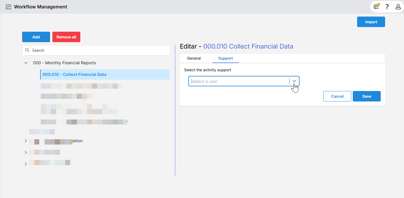 After adding an activity or a task to a workflow, the Support tab is enabled. You may assign a support user, but the structure’s responsible user cannot also be the task owner or support.